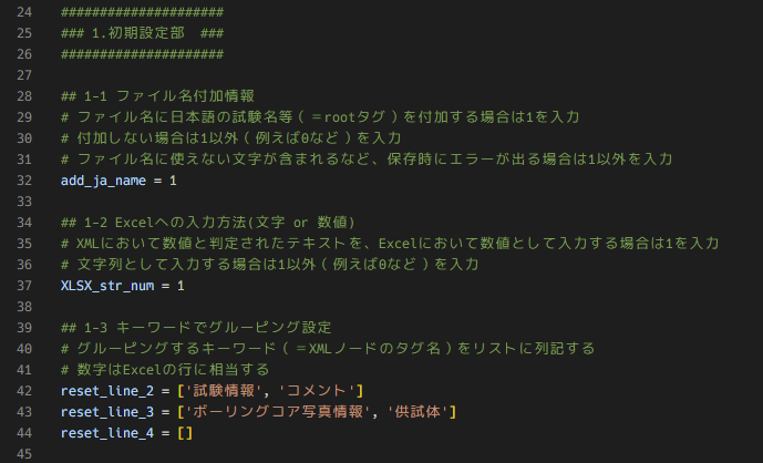 キーワードごとにグルーピングして抽出したい場合は「reset_line_2~4」に、該当するXMLタグの名称を追記してください。2~4はExcelの行に相当します。現在のソースコードには、土質データXMLファイルに含まれるタグをキーワードとしていくつか設定しています。実際に処理したいファイルが土質データと無関係でもこのキーワードは残しておいて構いません。エラーにはなりません。