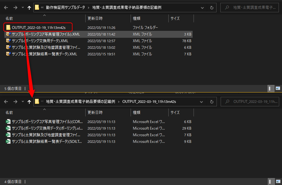 - ここでExcelデータは、XMLファイルがあるフォルダに「OUTPUT_[日付]_[時刻]」という名称の下位フォルダを作り、そこにXMLファイルと同名で保存されます。